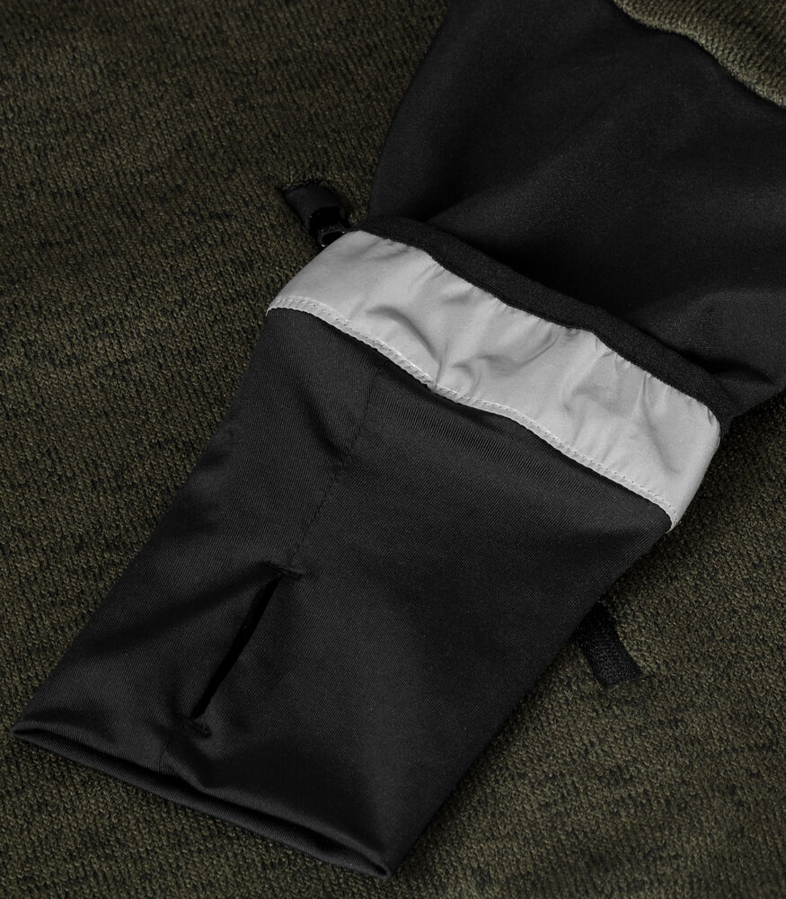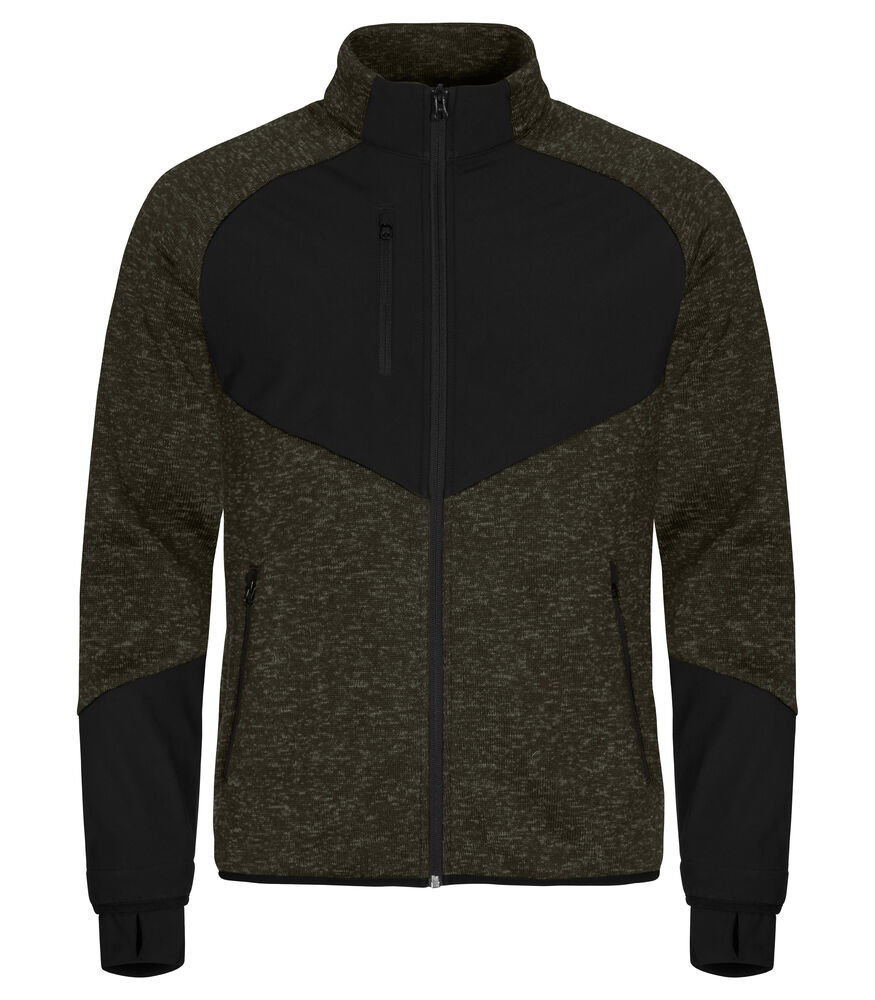 n varm, strikket fleecejakke med sektioner af softshell. Tre udvendige lommer med lynlås og to store inderlommer. Elastiske indvendige manchetter med hul til tommelfinger og foldbare refleksbånd. Strop i nakken og en let aftagelig neck label til ommærkning.