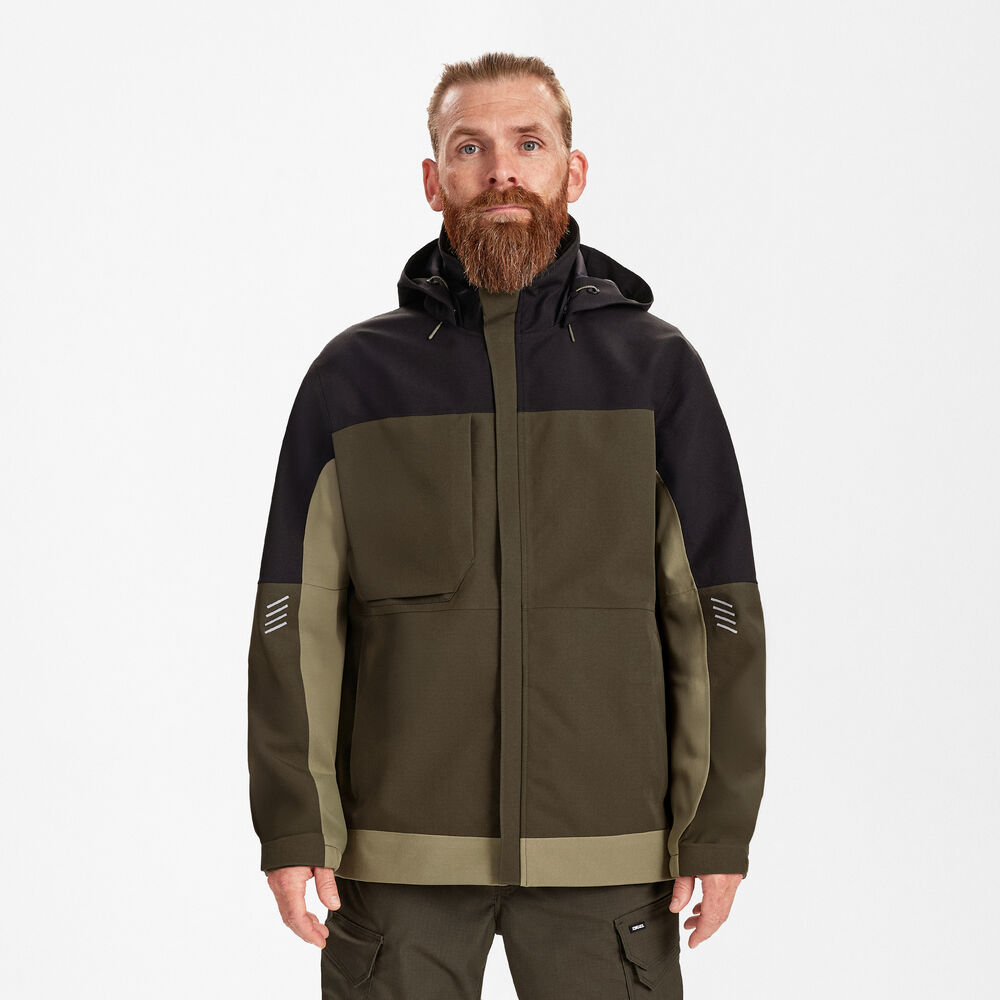 Vandtæt og åndbar med tapede sømme Ripstop med mekanisk stræk for øget bevægelighed Blød, vindbeskyttende inderkrave for god komfort Aftagelig og justerbar hætte for fleksibilitet Skjult lynlås i front med smal stolpelukning, så ridser undgås Rummelig brystlomme lukket med lynlås To sidelommer med lynlås til praktisk opbevaring Stor inderlomme med velcrolukning Elastik og velcro ved ærmeåbning for bedre pasform og komfort Forlænget bagstykke til beskyttelse af lænd Strop med D-ring til ID-kort Refleksprint på ærmer og ryg for øget synlighed Regulerbar bund med snøre, for nem tilpasning