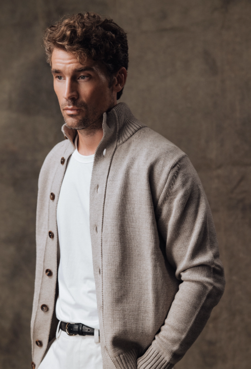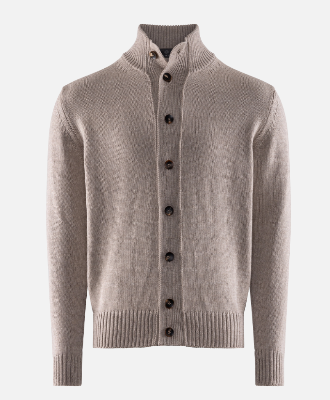 Yarn: 100% extra fine merino wool, mulesing-free (19,5 microns) Ply: 2/30 (2-ply) Knit: 5 gauge Weight: 495 g/sqm Hems: 1x1 rib knit (tubular collar) Button: 100% buffalo horn Dye: Yarn dyed (Melange: fiber dyed) Fully fashioned
