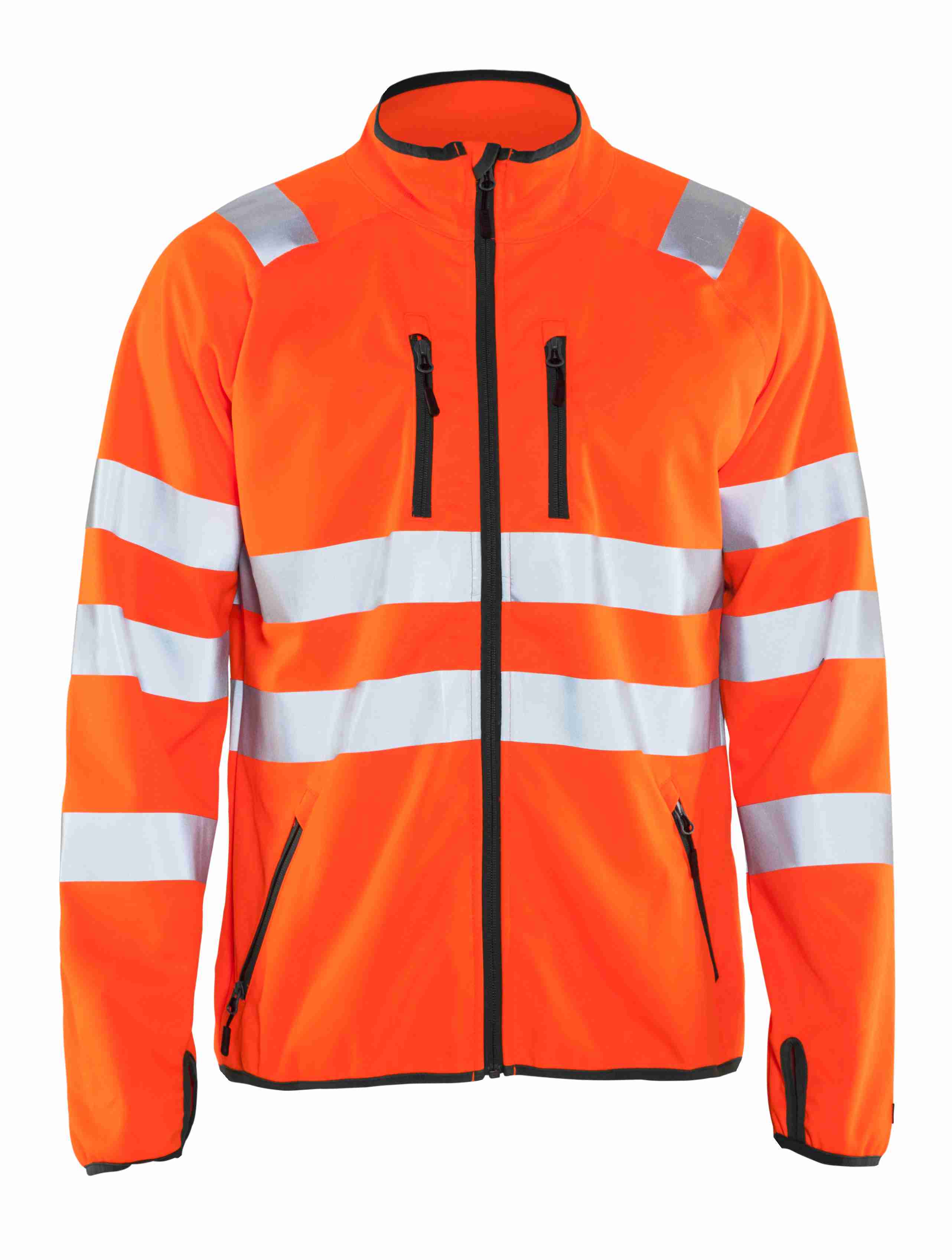 High Vis jakke med høj hals, der kan bæres hele året rundt, enten som et mellemlag under en jakke eller som det yderste lag - afhængig af vejret. Jakken er i softshell, ærmer med elastisk bånd og tommelfingergreb samt elastisk bånd forneden for ekstra komfort. Alle lommer er med lynlås. Certificeret i henhold til EN ISO 20471 Klasse 3
