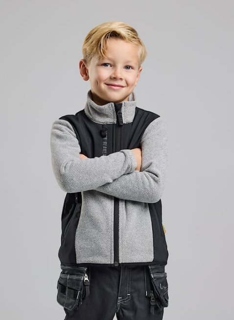 En strikket fleecetrøje til børn i en blød og komfortabel fleecekvalitet. Materialet beskrives bedst som tredimensionel fleece. Strækbar, fleksibel og varm.