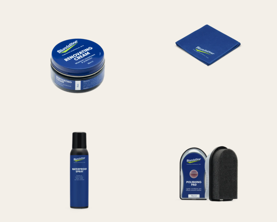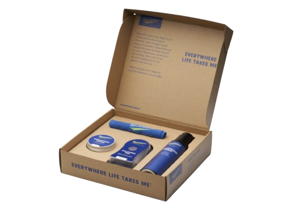 Individuelle plejeprodukter til fodtøj i ét skoplejesæt. Sættet indeholder vandafvisende spray, poleringspude, renovationscreme og poleringsklud.