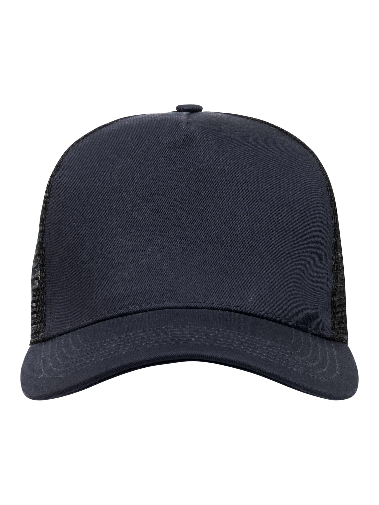 A trucker-style 5-panel cap made in brushed cotton twill with a polyester mesh back. Snapback closure. Light colors come with white mesh; dark colors with black mesh.