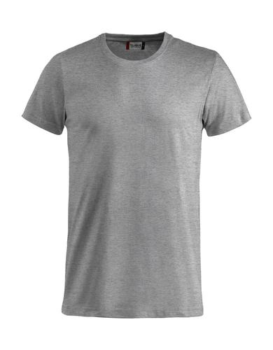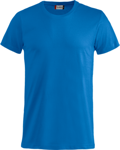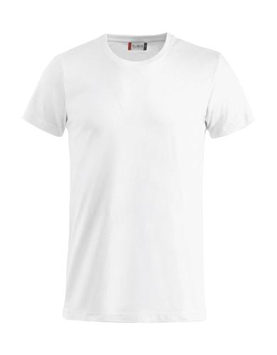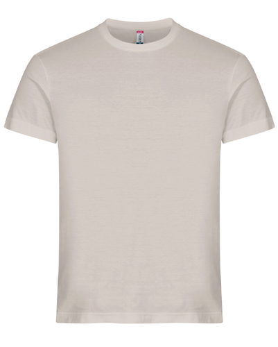 T-shirt med tætsiddende pasform, nakketape og ribbet krave med elastan. Rundstrikket på herremodel og sidesømme på damemodel.