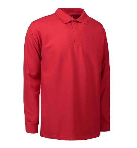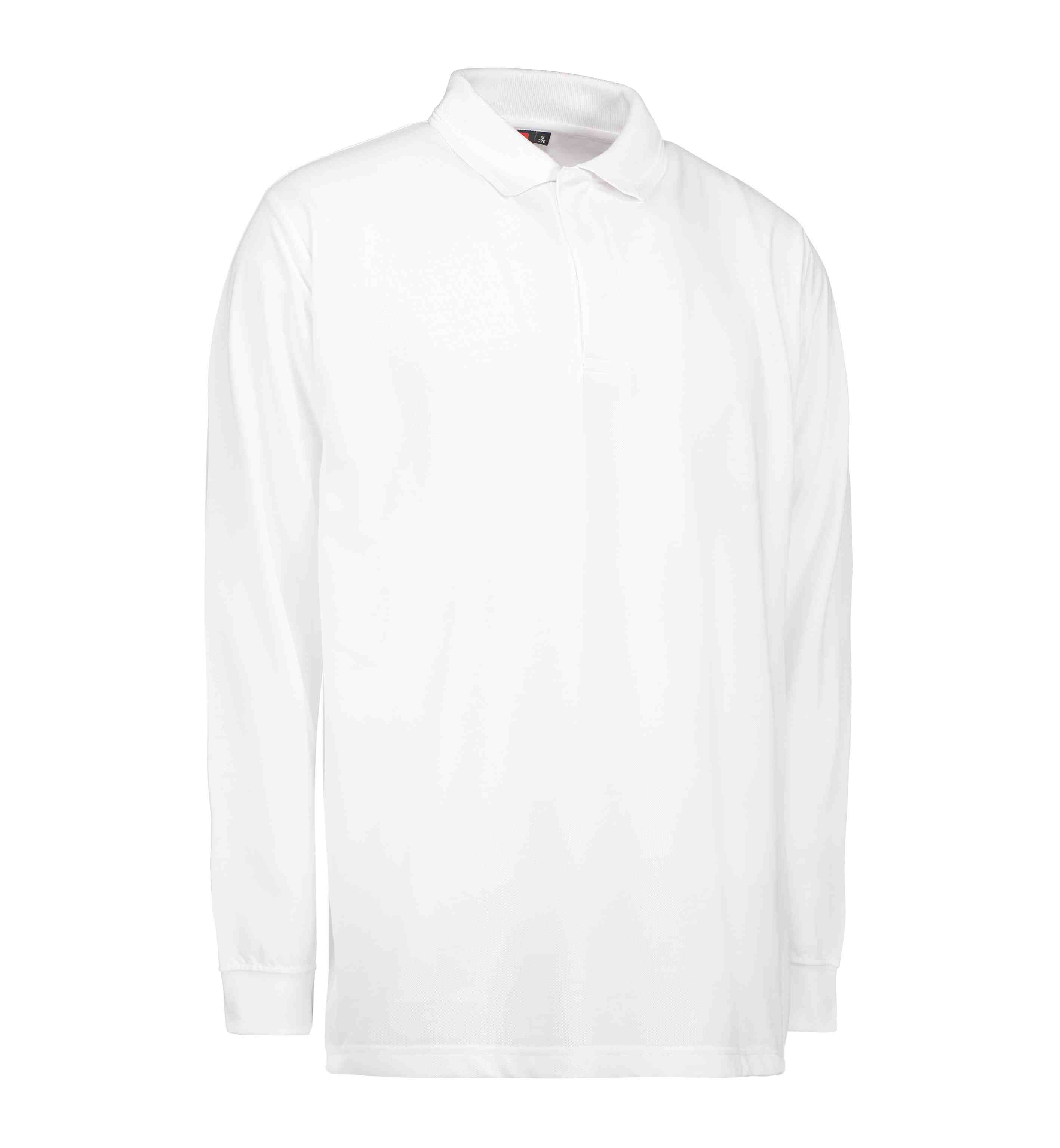Slidstærk poloshirt med lange ærmer og trykknapper i stolpen. Nakke- og skulderbånd og nakkespejl. Poloshirten har gennemgået en forkrympningsproces ved meget høje temperaturer, både før og efter indfarvningen, for ekstra stabilitet og lang levetid.
