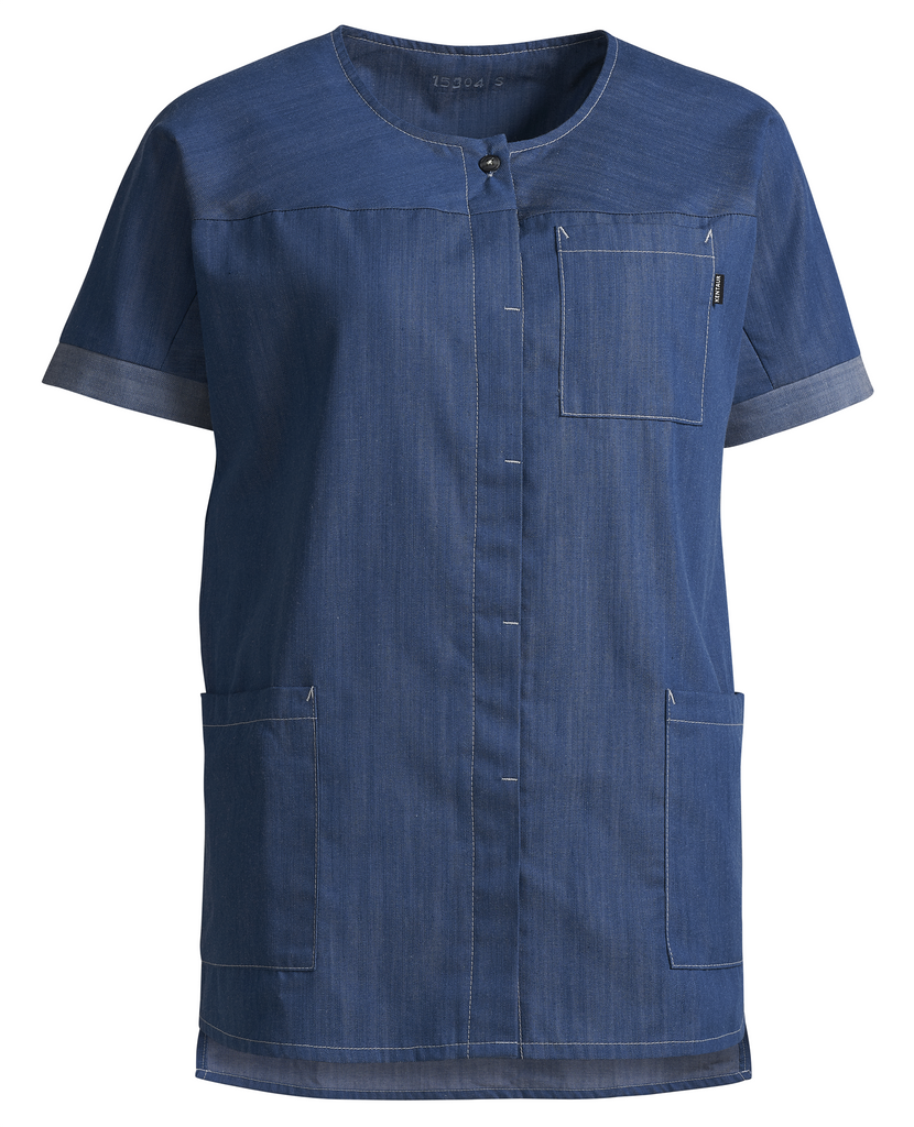 Enkelt og let design/Rund hals/1 brystlomme/2 hoftelommer med skjult trykknaplukning/Ergonomisk korrekt placerede hoftelommer/Ærmesnit som ikke løfter skjorten ved bevægelse/Split yoke (bærestykke) som giver øget strækbarhed over ryggen/Skjult trykknaplukn