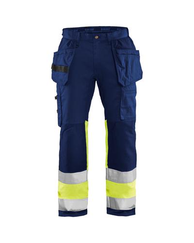 Lette og fleksible High Vis bukser i slidstærkt, men fleksibelt materiale, der er velegnede til krævende arbejdsmiljøer. Bukserne har særlig god bevægelsesfrihed på grund af stretch panelerne i skridtet, knæ og bagdelen. Forstærket knælommer i CORDURA® stretch materiale for større komfort, når du arbejder på knæ. Bukserne har flere funktionelle lommer og veldesignede detaljer, som udnyttes optimalt på denne model. Indvendig telefonlomme, tre-sektions sømlommer og tommestoklomme med knivholder og blyantlomme. Certificeret i henhold til EN ISO 20471 Klasse 1, beskyttelsesbeklædning med høj synlighed.