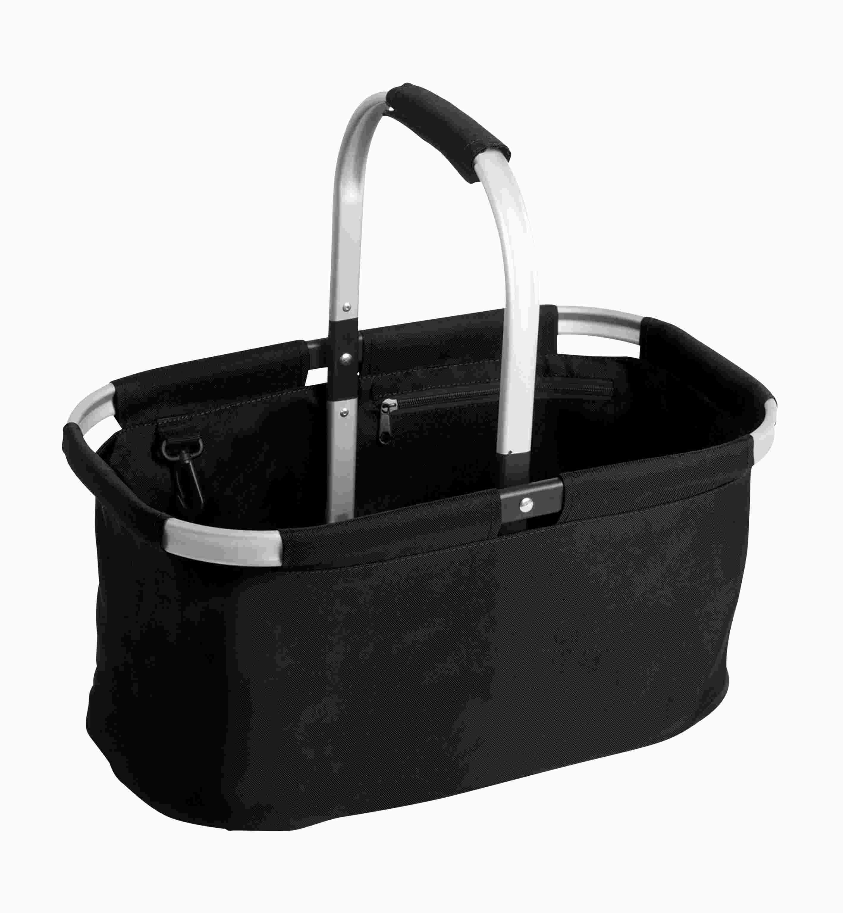 Sammenklappelig indkøbskurv med aluminiumsramme. Flot design og nem at folde sammen. Indvendig lynlåslomme og plastikkrog til nøgler m.m. SBS-lynlås.<br>46 x 28 cm / Højde: 24 cm<br>