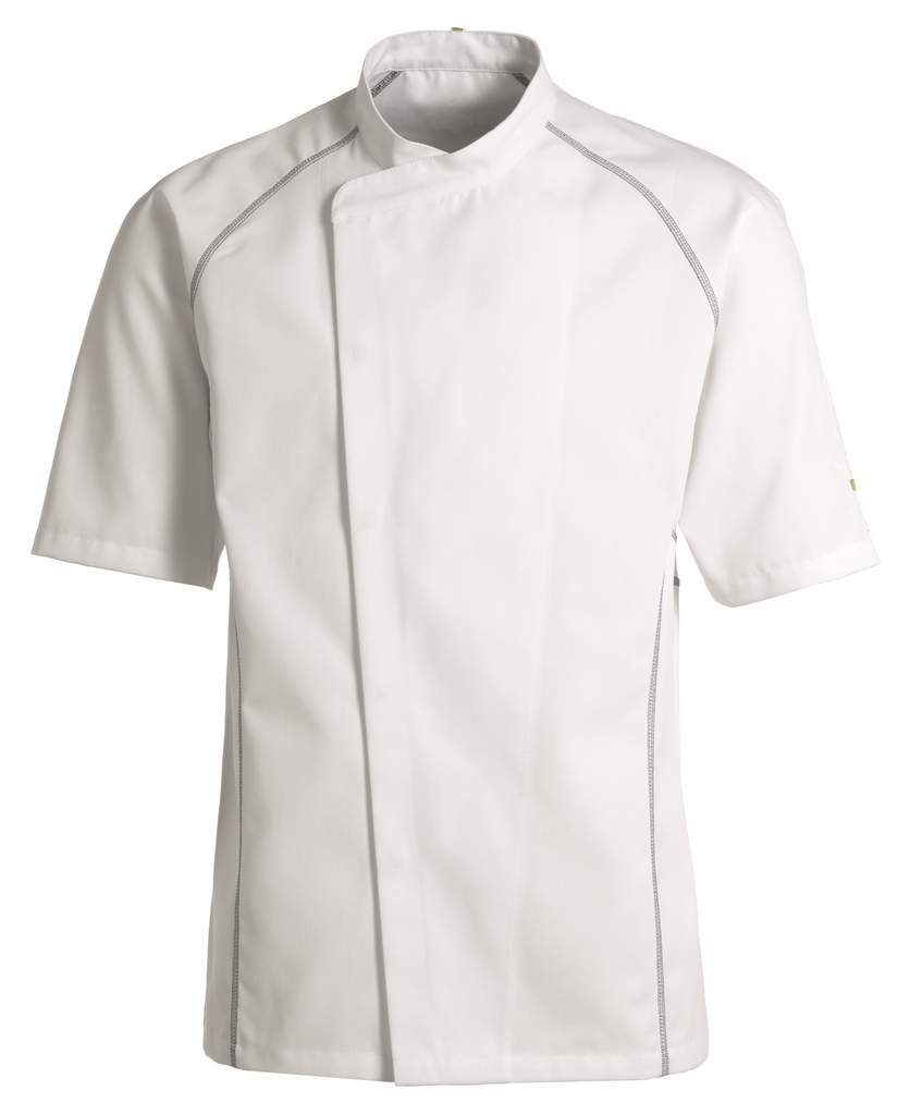Sustainable cotton på kv. 105 og 143 Recycled polyester fra PET flasker på kv. 105 og 143 Natural stretch på kv. 143 - svarer til 4% stræk Smart sporty design Let og åndbar kvalitet Kinakrave Nakkestrop til smækforklæde Flatlock stikninger Skjulte trykknapper Åndbart jersey i ryg og under ærmer, som giver god komfort og bevægelsesfrihed Korte ærmer Penlomme på venstre ærme
