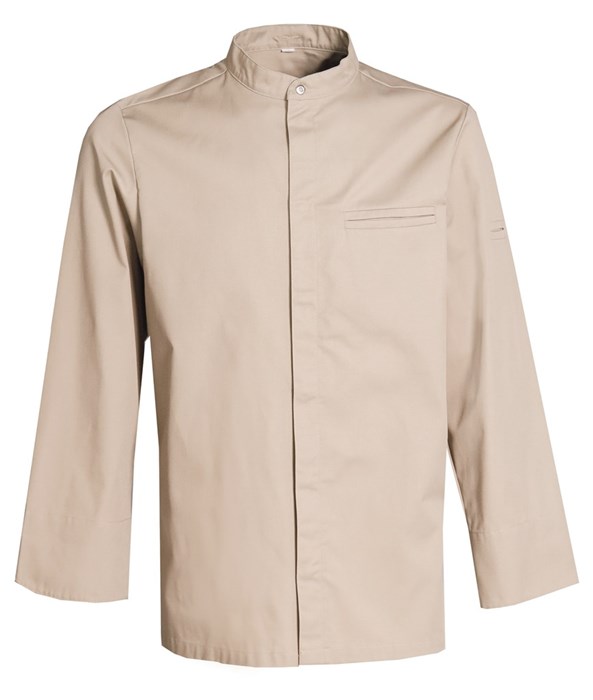 God og komfortabel pasform - Ekstra strækbarhed i ryggen - Praktisk ærmelængde, egnet til arbejde i køkken områder - Nakkestrop til kuskeforklæde - Paspellomme på brystet - Paspellomme på ærmet - Slidser i sider for bedre bevægelsesfrihed New Nordic er en ny kollektion til kokke og tjenere som kommer i et bredt udvalg af kokkejakker og skjorter, bukser, forklæder og en udendørsjakke. Inspireret af vores nordiske natur og arv kombineret med minimalistisk indflydelse. En blanding af højteknologiske og bæredygtige materialer og innovative design detaljer, gør New Nordic kollektionen til et eksklusivt valg for kokke, tjenere og generelt alle medarbejdere i gastronomi sektoren/segmentet. Kvaliteter og farver er hentet fra det rå nordiske miljø. Letvægts kvaliteter i langtidsholdbar polyester/bomuld. Genanvendt polyester og økologisk bomuld er to vigtige bæredygtige valg af kvaliteter, sammen med kraftig kanvas med et rustikt look og som beskytter mod varm mad og væsker i køkkener. Farverne er frisk hvid, khaki, brun/grønne nuancer og dyb sort.