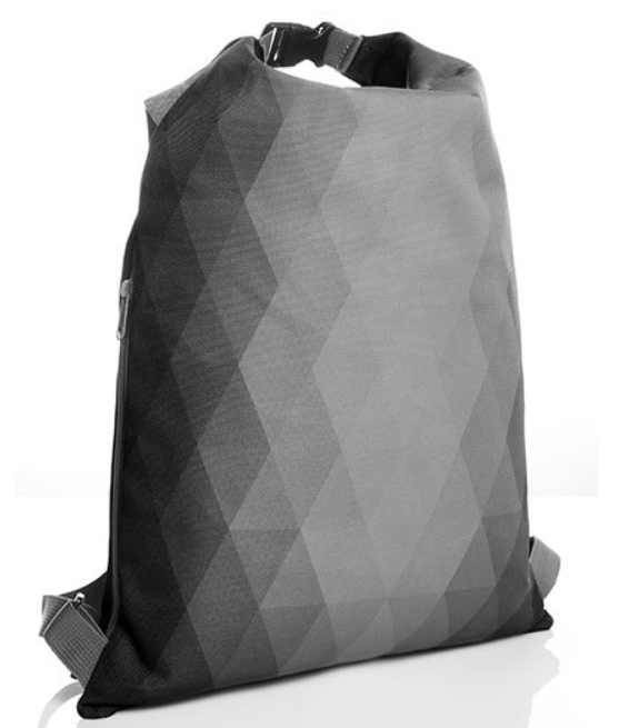 Letvægt, innovativ rygsæk med diamant mønster Kan bæres på begge sider Hovedrum med lynlås og rullelukning Sidelomme Vævet, justerbar skulderstrop Leveres uden dekoration/indhold Kapacitet: 12 L